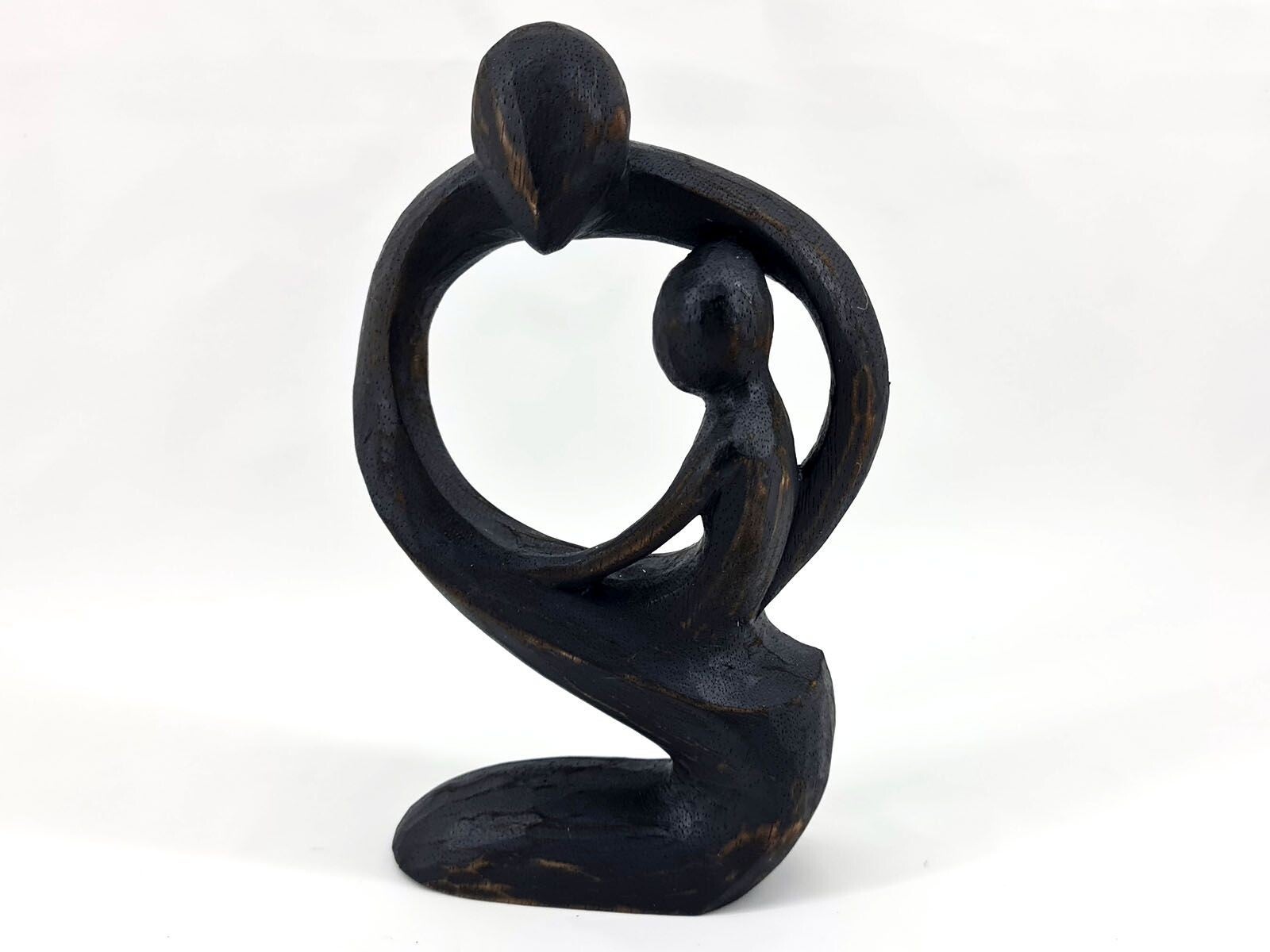 Breng warmte en verbondenheid in huis met dit stijlvolle houten beeld van ouder en kind. Het abstracte design maakt het een elegant decoratief accent voor elke ruimte, terwijl het natuurlijke en zwarte kleurenschema tijdloze charme toevoegt.