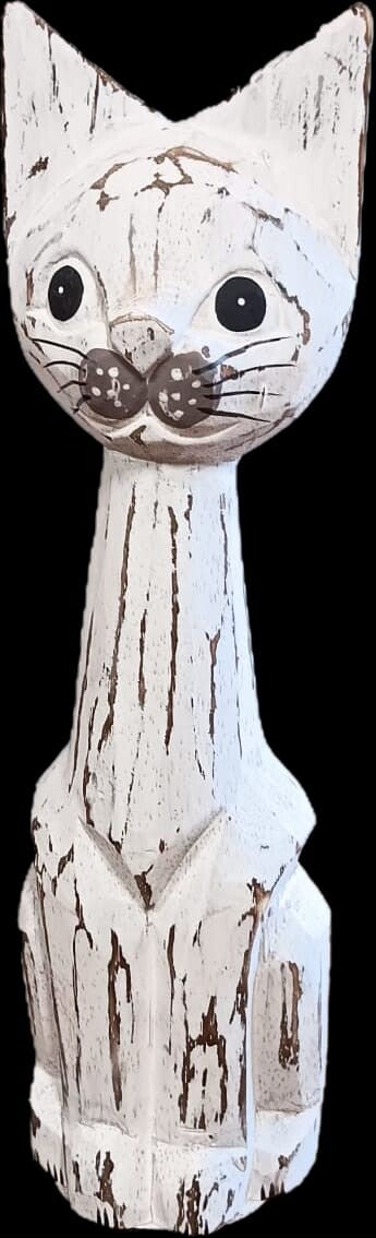 Breng speelsheid en stijl in je interieur met deze houten katten in twee formaten: groot (ca. 38x9 cm) en klein (ca. 32x8 cm). Verkrijgbaar als set of los, perfect als charmant decoratief accent op een plank, vensterbank of kast.